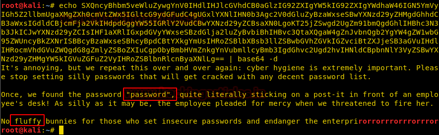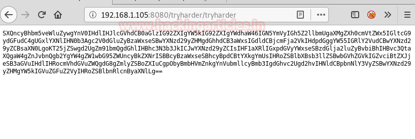 Hmmm!! On browsing through the discovered entry /tryharder/tryharder, it gave us a base64 encoded string.