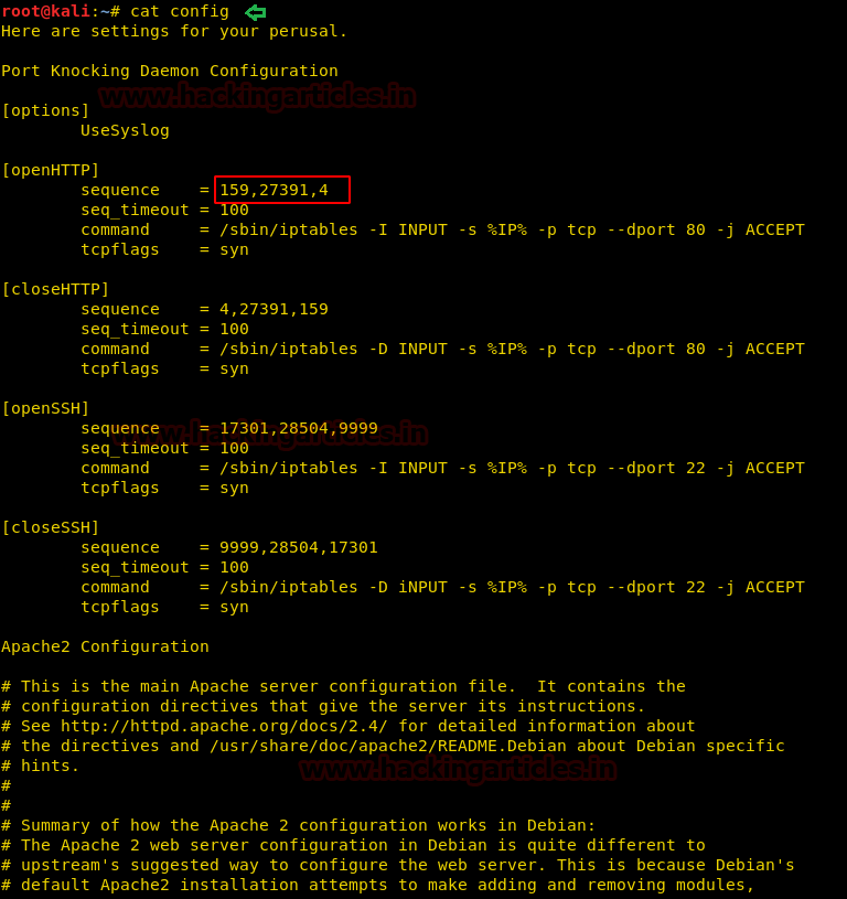 Reading the contents of the config file gave us a sequence of ports to knock which will result in opening the http port 80.