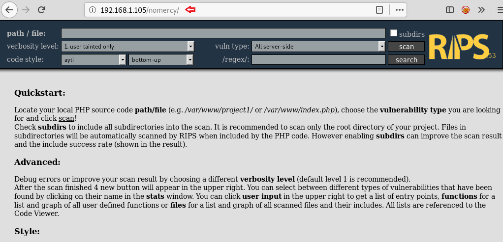 Browsing through the directory 192.168.1.105/nomercy in the browser opened a vulnerability scanner webpage whose banner RIPS 0.53 left us curious to search more about it.