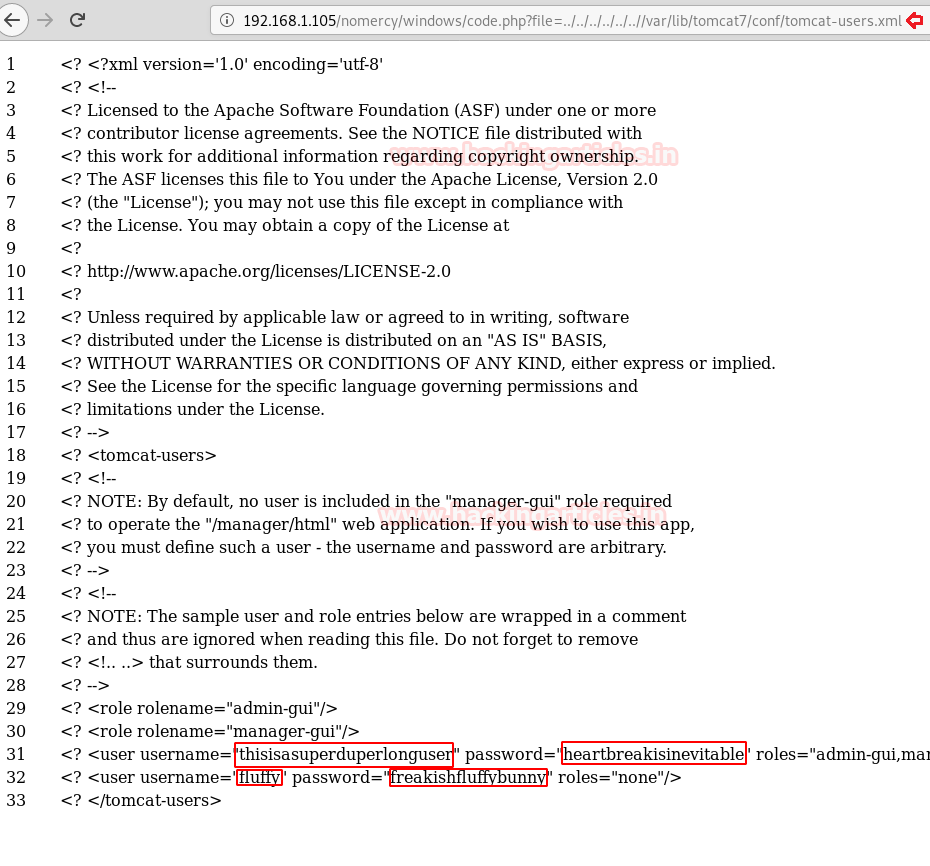 Since we know there is a tomcat service running on the target system we can take a look the tomcat-users.xml file using LFI that will provide us with the username and password, exploring it on browser gave us two Login Credentials for Tomcat Server as shown on the image.