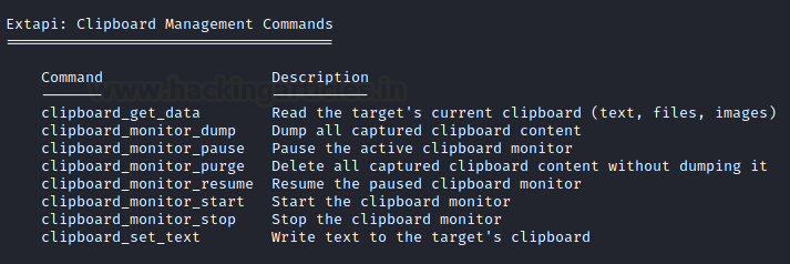 Running the help command generates a list of commands that users can run from the meterpreter shell. In addition to regular commands, the list also includes commands that are part of the Extapi module. Here, we can observe commands for reading the target’s clipboard data, dumping captured clipboard data, initializing, pausing, resuming, terminating clipboard capture, and setting clipboard data on the target.