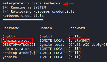 Similarly, if we want to extract the credentials from the Kerberos Service, we can run the creds_kerberos to attack the Kerberos. This however have the ability to extract clear text passwords for the users.