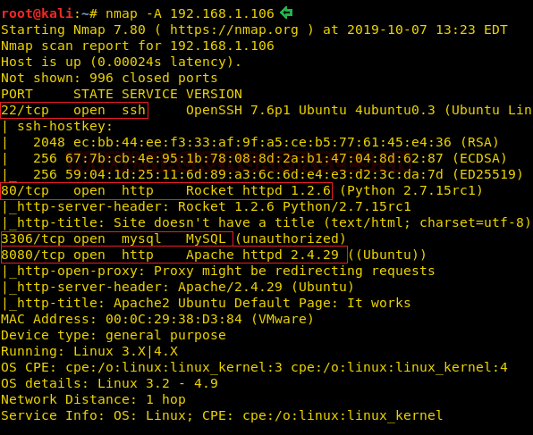 We learned from the scan that we have the port 80 open which is hosting Rocket httpd service, and we have the port 22 open. This tells us that we also have the OpenSSH service running on the target machine. We also have 3306 which hints us to a database situation. Also, we have the Apache httpd running on the port 8080.