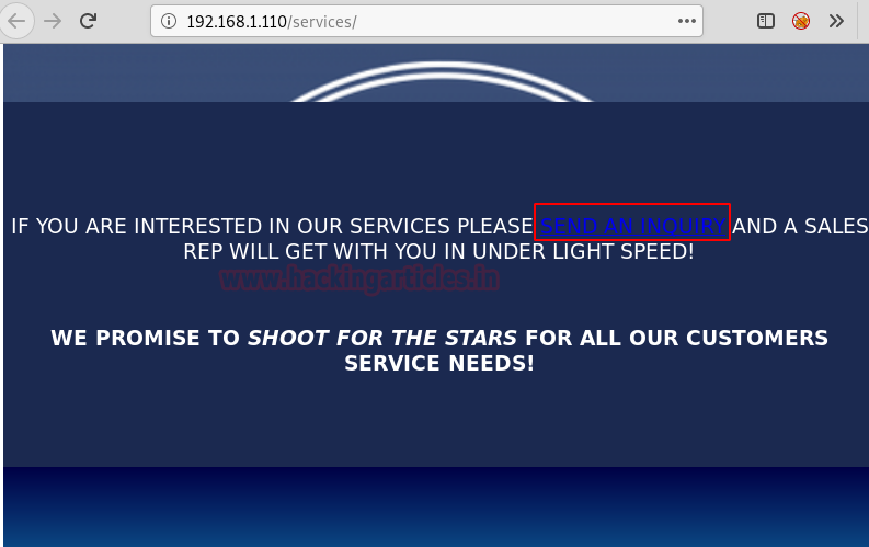 Let’s just browse the found directory /services in the browser where at bottom of the webpage we saw a SEND AN INQUIRY Hyperlink. Let’s find out where it will lead us by clicking on it.