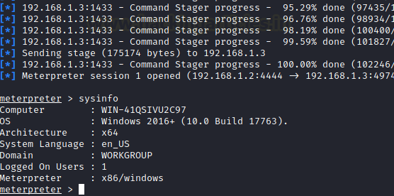As you can see in the above image, the exploit is trying to enable the xp_cmdshell to have our session. We have written a detailed article on xp_cmdshell, which you can read here. Once the xp_cmdshel is successfully enabled, we will have our meterpreter session as shown in the image below: