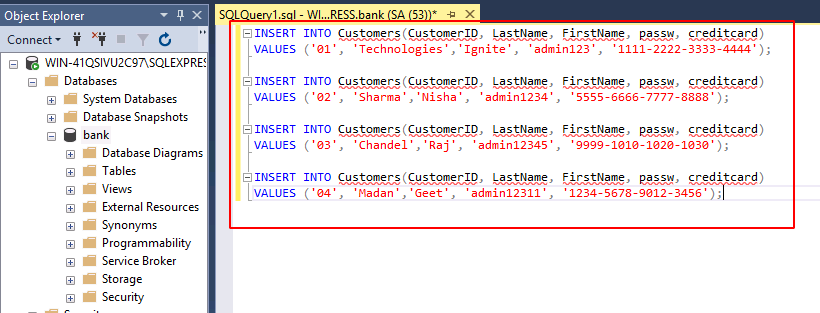 INSERT INTO Customers(CustomerID, LastName, FirstName, passw, creditcard) VALUES ('01', 'Technologies','Ignite', 'admin123', '1111-2222-3333-4444'); INSERT INTO Customers(CustomerID, LastName, FirstName, passw, creditcard) VALUES ('02', 'Sharma','Nisha', 'admin1234', '5555-6666-7777-8888'); INSERT INTO Customers(CustomerID, LastName, FirstName, passw, creditcard) VALUES ('03', 'Chandel','Raj', 'admin12345', '9999-1010-1020-1030'); INSERT INTO Customers(CustomerID, LastName, FirstName, passw, creditcard) VALUES ('04', 'Madan','Geet', 'admin12311', '1234-5678-9012-3456');