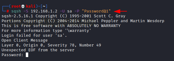 sqsh -S 192.168.1.2 -U sa -P "password@1"
