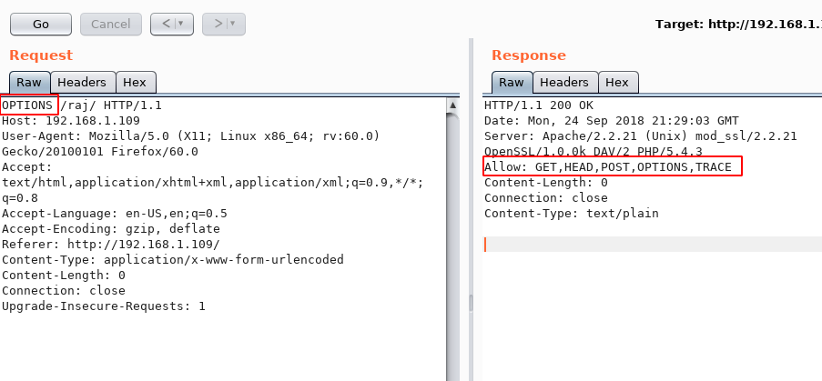 As shown, the RESPONSE from the web server not only displays the list of HTTP methods allowed. However also highlights the server version details (Eg: Apache/2.2.21 (Unix) mod_ssl/2.2.21 OpenSSL 1.0.0/k DAV/2 PHP/5.4.3)