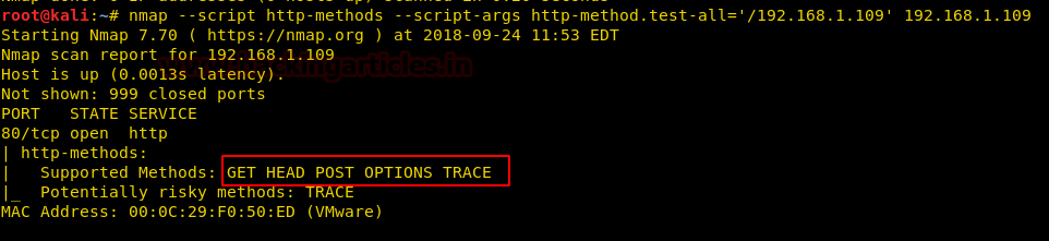 Let us use the NMAP command to enumerate all of the HTTP methods supported by a web server on the target URL as follows :