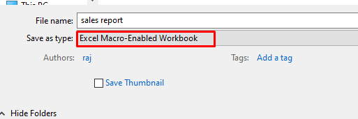 After pasting the code, we choose the Save As option from the menu. It opens up a window. In this window, we name the file and We choose Excel Macro-Enabled Workbook as shown in the image given below. We click the Save button after filling in the necessary details.