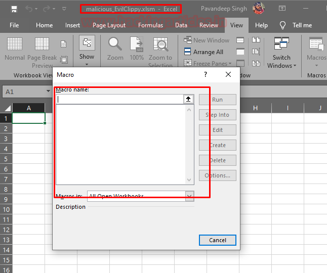 Then, we open an Excel Workbook. And then create macros as we did earlier in this article. In the image given below, we name our macro “malicious” and click on the create button.