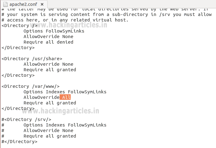 <Directory /var/www/> Options Indexes FollowSymLinks AllowOverride All Require all granted </Directory>