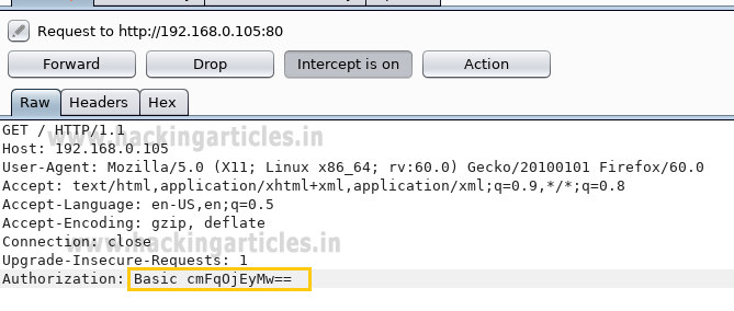 Thus the sent request is captured by burp suite which you can see in the given below image. In the screenshot, I had highlighted some value in the last line. Here it says the type of authentication provided is basic and if you have read above theory of basic authentication I had described that it is encoded in base64.