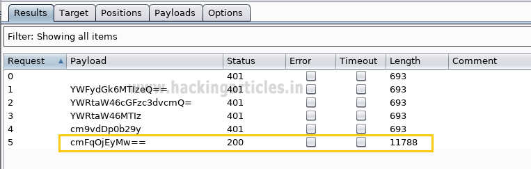 This will start a brute force attack and try to match string for user authentication. In the screenshot, you can observe the status “200 OK” and length “11788” of the highlighted value is different from the rest of the values. This means we can use this encoded value to bypass the user authentication, which occurs from request number 5. Now check the username and password on the 5th line in the dictionary. In the dictionary I found raj: 123 have matching authentication.