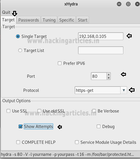 Open xHydra in your Kali. And select Single Target option and there give the IP of your victim PC. And select HTTP in the box against Protocol option and give the port number 80 against the port option.