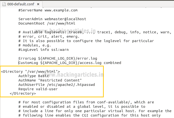 <Directory "/var/www/html"> AuthType Basic AuthName "Restricted Content" AuthUserFile /etc/apache2/.htpasswd Require valid-user </Directory>