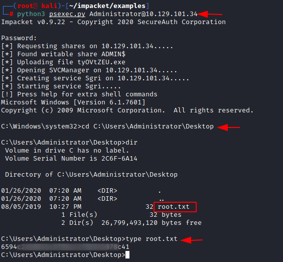 python3 psexec.py Administrator@10.129.101.34 cd C:\Users\Administrator\Desktop\ type root.txt