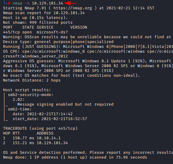 The Nmap Version scan quickly gave us some great information. It positively informed that SMB (445) service is running on the machine.