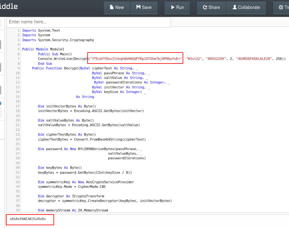 After inspecting the code, we feel like the code is trying to integrate with Active Directory that means that if we crack this password, we can get the administrator access on the target machine. We went back to the Fiddle and then replaced the encrypted code and ran the code. Then we have the unencrypted password.