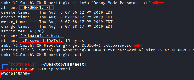 This is where we thought we are missing something. The Debug Mode Password shouldn’t be empty. We go back to the SMB share and see that it is reported as 0 in size there too. It is then when it hit us that it is possible to hide data in the Alternative Data Stream of a certain file. We decided to check for streams using allinfo command. Then, we found that there is an alternative data stream by the name of Password. So, we download the file again this time with the alternative data stream. Then, we read the password to find a password as shown in the image.