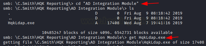 There is an executable file called HqkLdap.exe inside the same directory, we download it through our SMB session.