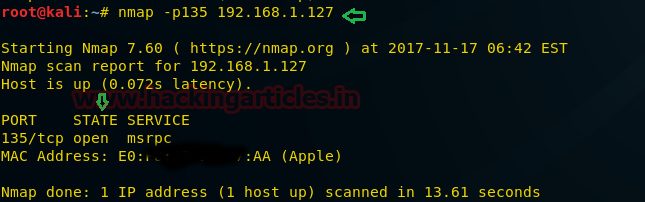 Above command will try to connect with port 135 as result if port is open then it will display state “open” as well as “service” running on that particular port.