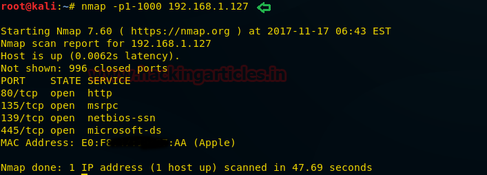Above syntax is used for scanning all ports of target network, keep patience while executing above format because it will take some time to enumerate open port or you can also execute given below command which uses parameter “–open” to perform same task in order to save time.