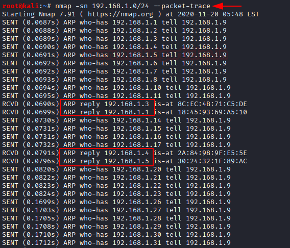Let us try the same by using the no port scanning (-sn) option. In this option, we are also using –packet-trace option which will enable you to see the detailed packet transfer without making use of Wireshark. Here you can observe the ARP packets being received.