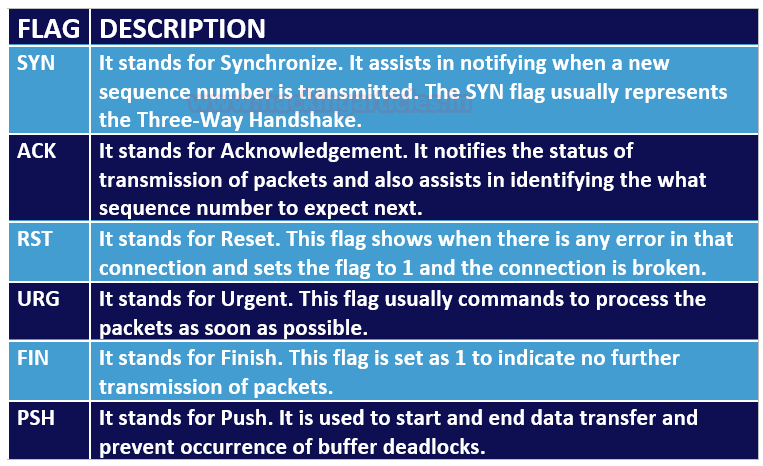 First, let’s get to know the basics about the communication Flags in TCP. The TCP header mainly consists of six flags that manage the connection between the systems and provide instructions to them. Each flag is of 1 bit and hence the size of TCP Flags is 6 bits. Now let us briefly understand each flag.