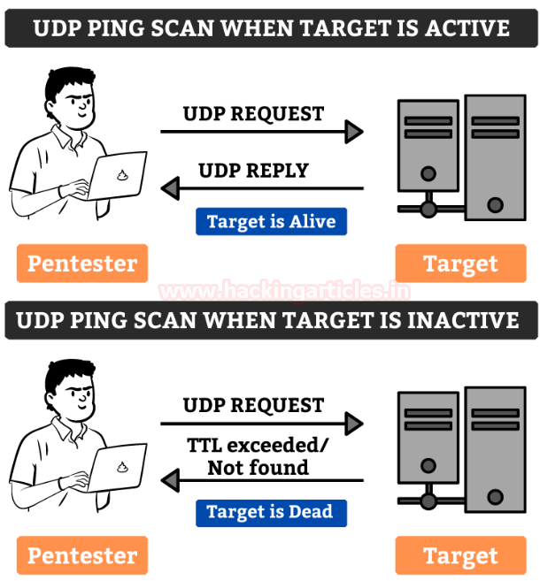 The UDP Ping Scans uses a highly uncommon default port number 40125 to send packets to the target. It is similar to TCP Ping scan. The Pentester will send the UDP Packets to the target and if there is a response in return, which means that the host is alive, or else it is offline