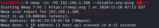 nmap -sn -PS 192.168.1.108 --disable-arp-ping