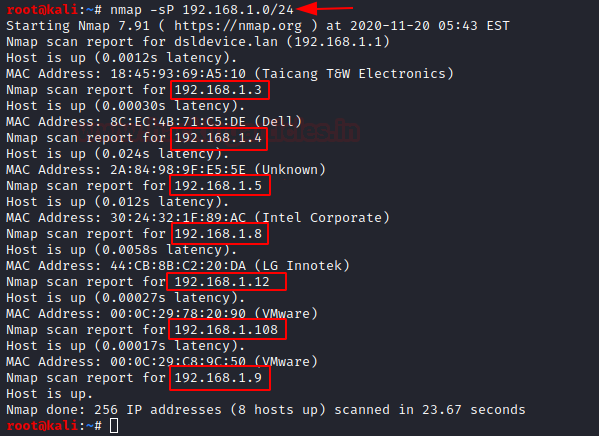 Let’s begin with scanning the entire network by using the Ping sweep scan (-sP).