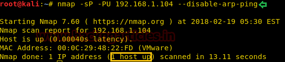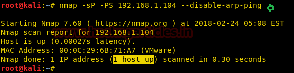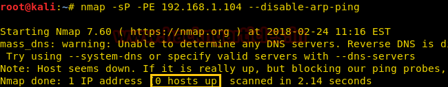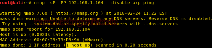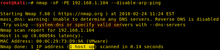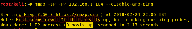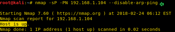 nmap -sP -PN 192.168.1.104 --disable-arp-ping