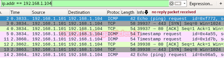 Demonstrating NMAP ICMP echo Ping with Wireshark shows only ICMP request packet in the network and didn’t receive any reply packet from the host network as shown in the given below image.
