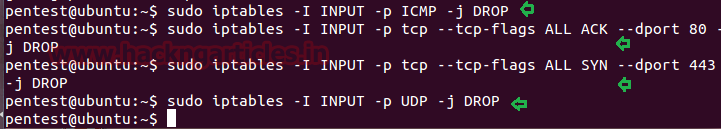 sudo iptables -I INPUT -p ICMP -j DROP sudo iptables -I INPUT -p tcp --tcp-flags ALL ACK --dport 80 -j DROP sudo iptables -I INPUT -p tcp --tcp-flags ALL SYN --dport 443 -j DROP sudo iptables -I INPUT -p UDP -j DROP