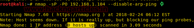 nmap -sP -PO 192.168.1.104 --disable-arp-ping